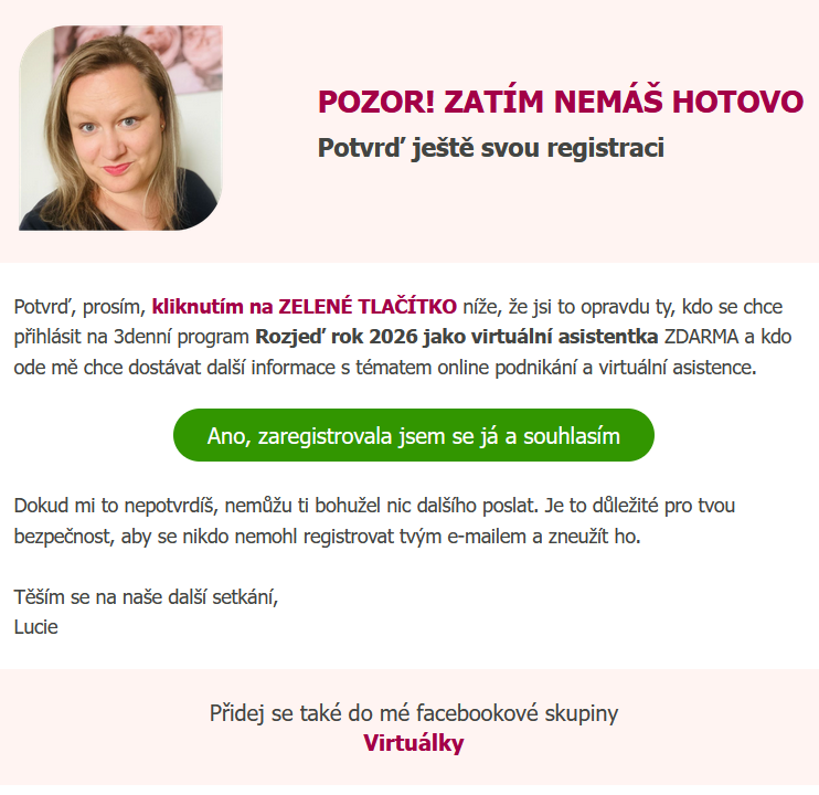Ve své e-mailové schránce vyhledej zprávu od odesílatele Lucie Doležalová odeslanou z adresy lucie@provirtualky.cz, která má předmět "Téměř hotovo, ještě mi prosím potvrď e-mail"